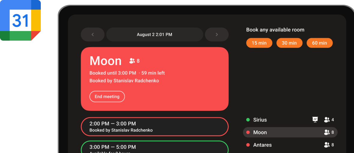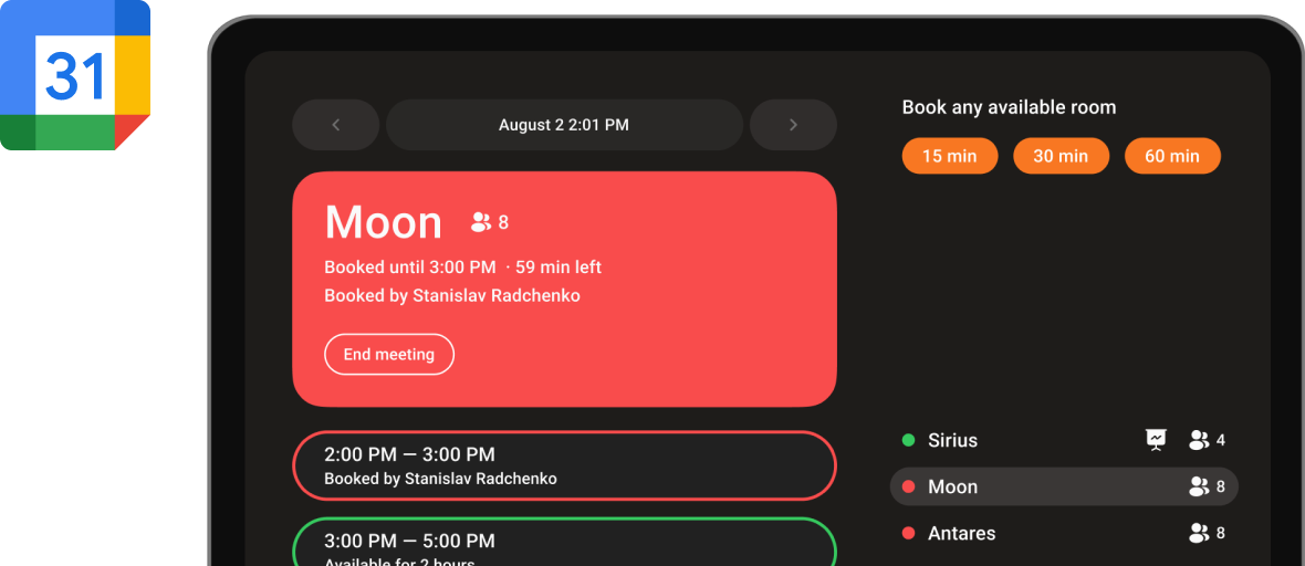 Book on the tablet, see it in your calendar (and back) — synced instantly and seamlessly